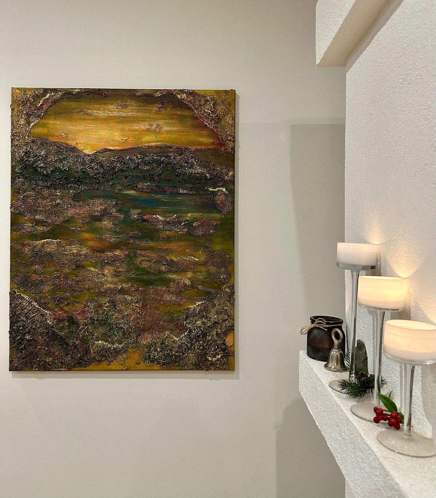 " Yksi ihan ensimmäisistä sisustukseen liittyvistä päätöksistä uuteen kampaamoon oli tilaukseen laitettu taulu, jolle oli tarjolla paikka sisääntuloaulassa, paraatipaikalla! Jenna taidetta nähtyäni olin varma, että hän osaisi luoda juuri oikeanlaisen palan pohjoista taikaa meille. Toiveiden mukaan hän maalais upean, tunnelmallisen ja valossa hohtavan teoksen, jota onkin meillä ihasteltu viikottain! Lämmin suositus tämän sydämmellisen taiteilijan upeille töille."